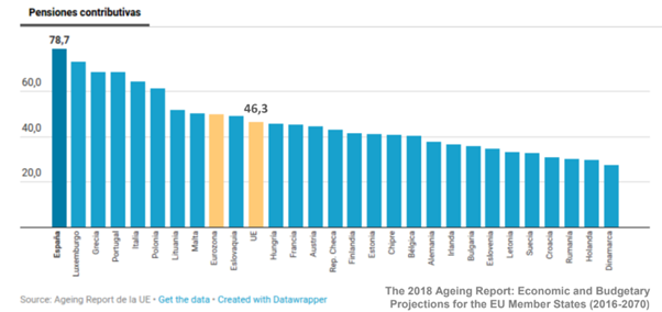 A pesar de las reformas en las pensiones, España se sitúa en el país de la UE con las pensiones más altas en base a la tasa de sustitución, que es del 78,7%, mientras que la media de la UE es del 46,3%*.